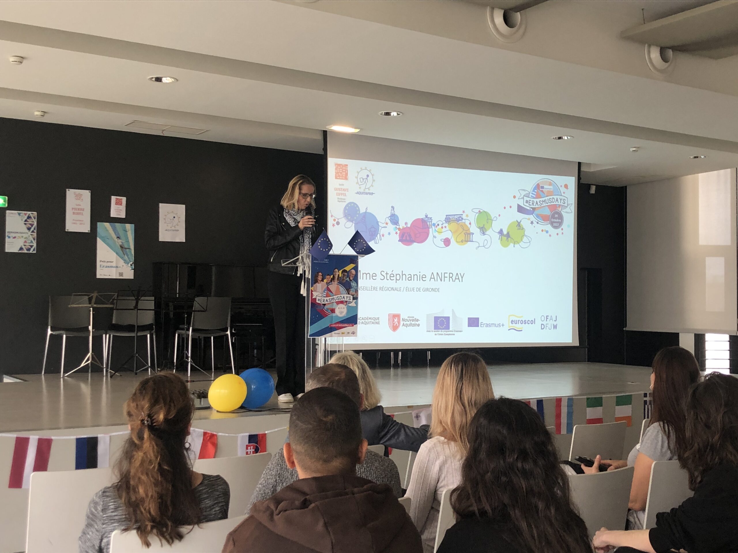 L’honneur de l’ouverture est revenue à Laurent Len (Proviseur du lycée Gustave Eiffel) qui a souligné l’importance de la mobilité dans le parcours des jeunes, suivi de Stéphanie Anfray (conseillère régionale et élue de la Gironde) et de Glenda Gilmore (Agence Erasmus+) qui a rappelé l’évolution du programme Erasmus+ qui s’étend désormais à tous les publics et ne se limite plus aux étudiants (si chers à l’Auberge espagnole !)… la preuve en est d’ailleurs apportée par nos jeunes diplômés qui sont tous issus de filières professionnelles.
